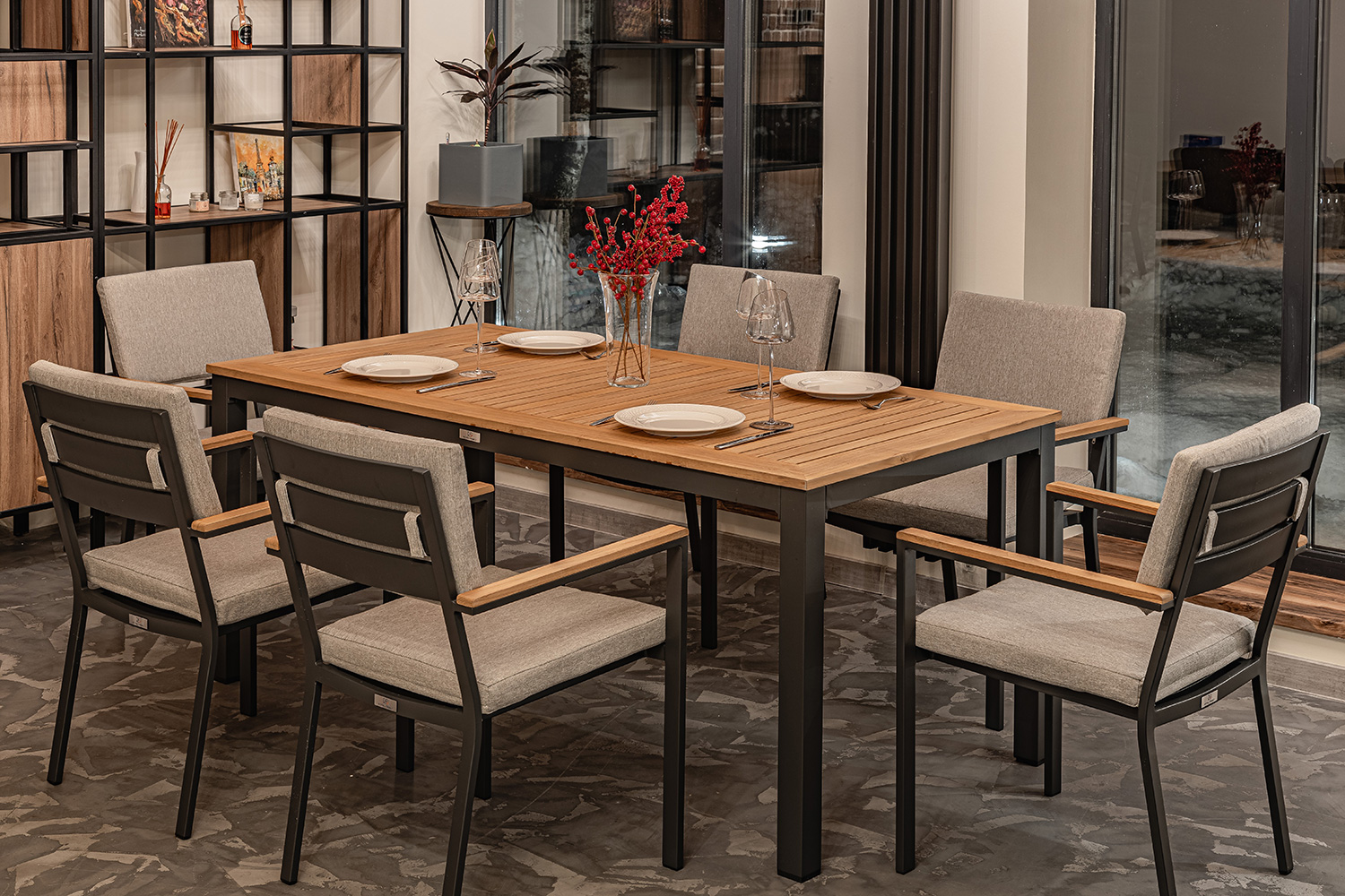 Состоит мебель из алюминия (каркас), окрашенный в черный цвет. Материал столешницы – массив тика, древесины, часто используемой во многих отраслях промышленности, включая судостроение, изготовление мебели и напольных покрытий.