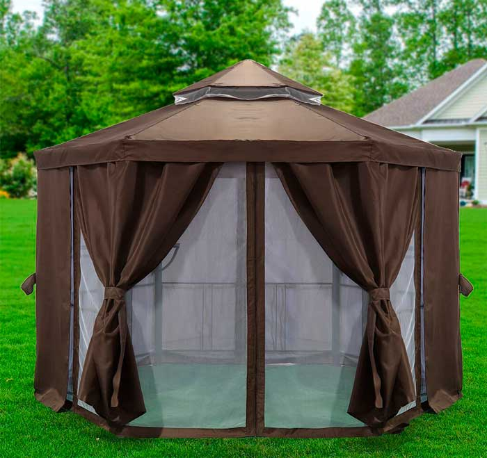 Хотим предложить вам приобрести такое изделие, как комплект для шестиугольного шатра. Данный комплект выполнен в коричневом цвете. В нём находится крыша-тент с клапаном для проветривания, плотные шторы, а также москитная сетка, которая защищает от насекомых. Это наилучший вариант в том случае, если вы хотите сделать свой отдых более комфортным. Комплект защитит вас от солнечных лучей, ветра, дождя, насекомых. Подойдёт комплект для размеров шатра 1,75 х 1,75 х 2,75 м. Крыша изготовлена из полиэстера с плотностью 160 г, а боковые стенки из полиэстера плотностью 140 г с сеткой.