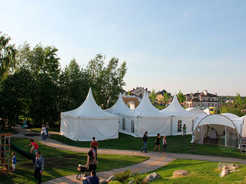 Такие шатры не имеют нагромождений несущих элементов в конструкции. Высокие потолки, и покатые стены позволяют увеличить количество свободного пространства. При необходимости конструкции можно легко соединять между собой, что позволяет изменить форму и размеры шатра.